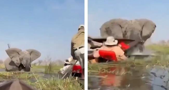 കാഴ്ചക്കാരിൽ ഭീതി സൃക്ഷ്ടിച്ച ഓട്ടത്തിന് ശേഷം ആന വള്ളങ്ങളിലൊന്ന് മറിച്ച്, അതിലെ യാത്രക്കാരെ താഴെയിട്ടു. ഭാഗ്യത്തിന് ആന പിന്നീട് കാട്ടിലേക്ക് ഓടിപ്പോയതിനാൽ വലിയൊരു ദുരന്തം ഒഴിവായി. ഒകവാംഗോ ഡെൽറ്റയിലെ സഫാരി യാത്രയ്ക്കിടെയാണ് സംഭവം.