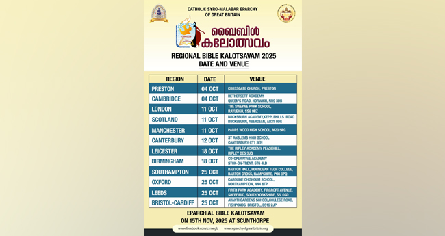 ഗ്രേറ്റ് ബ്രിട്ടൻ സീറോമലബാർ രൂപത ലണ്ടൻ, സ്കോട്ലൻഡ്, മാഞ്ചസ്റ്റർ റീജിയണൽ ബൈബിൾ കലോത്സവം ഇന്ന്