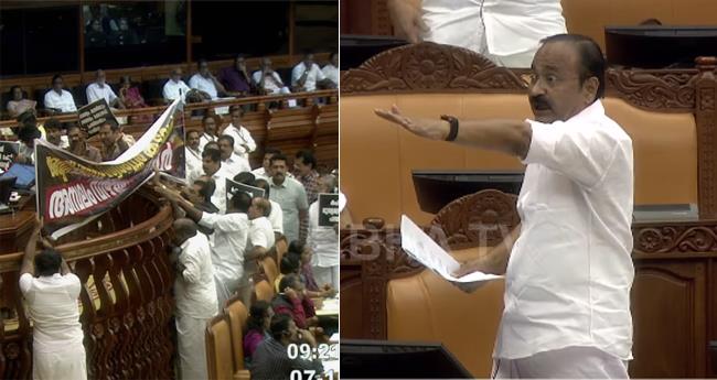 ടി. സിദ്ദിഖും അൻവർ സാദത്തുമായിരുന്നു ഈ മുദ്രാവാക്യങ്ങൾ ഉച്ചത്തിൽ വിളിച്ചുകൊടുത്തത്. നടുത്തളത്തിലിറങ്ങിയ പ്രതിപക്ഷ അംഗങ്ങൾ ഇത് ഏറ്റുവിളിച്ചു. പ്രതിപക്ഷ ബഹളത്തിനിടയിലും സഭാനടപടികൾ തുടർന്ന സ്പീക്കർക്കെതിരേയും മുദ്രാവാക്യമുണ്ടായി. “സ്വർണം കട്ട വകുപ്പേതാ, പറയൂ പറയൂ സ്പീക്കറേ, പ്രതിഷേധങ്ങൾ കാണുന്നില്ലേ ’’ എന്നിങ്ങനെയായിരുന്നു മുദ്രാവാക്യങ്ങൾ.