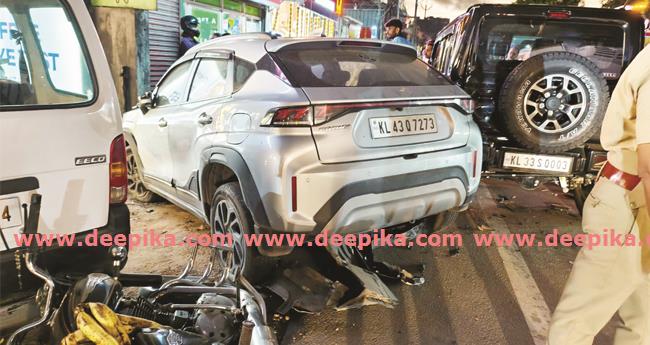 അപകടത്തിൽ ഗുരുതര പരിക്കേറ്റ ഒരാളെ ആശുപത്രിയിൽ പ്രവേശിപ്പിച്ചു. കുണ്ടന്നൂർ ഭാഗത്തേക്ക് പോകുകയായിരുന്ന യുവതി ഓടിച്ച കാർ ആദ്യം ഒരു ബുള്ളറ്റിൽ ഇടിക്കുകയായിരുന്നു. പിന്നീട് നിയന്ത്രണം വിട്ട കാർ നാല് ഇരുചക്ര വാഹനങ്ങളിലും ഒരു ഓട്ടോയിലുമിടിച്ചു. പിന്നാലെ മറ്റൊരു കാറിൽ ഇടിച്ചതിനെ തുടർന്ന് ഇടിയേറ്റ കാർ വട്ടം തിരിഞ്ഞ് പിക് അപ്പ് വാഹനത്തിലുമിടിച്ചു. അപകടമുണ്ടാക്കിയ കാർ സമീപത്തെ മതിലിലിടിച്ചാണ് നിന്നത്.