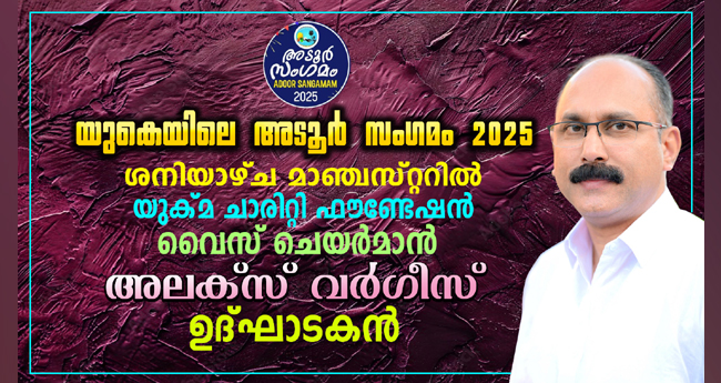 മാഞ്ചസ്റ്റർ: യുകെയിലെ അടൂർ സംഗമം - 2025 ശനിയാഴ്ച മാഞ്ചസ്റ്ററിലെ സാൽ ഫോർഡ് സെന്റ് ജെയിംസ് ഹാളിൽ നടക്കും. സംഗമം യുക്മ ചാരിറ്റി ഫൗണ്ടേഷൻ വൈസ് ചെയർമാൻ അലക്സ് വർഗീസ് ഉദ്ഘാടനം ചെയ്യും.