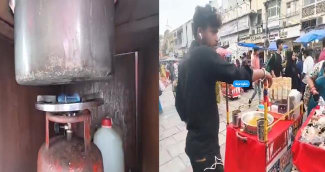 വീ​ഡി​യോ ചി​ത്രീ​ക​രി​ക്കു​ന്ന​തി​നി​ട​യി​ൽ, ക​ച്ച​വ​ട​ക്കാ​ര​ൻ മു​ഖം മ​റ​യ്ക്കാ​ൻ ശ്ര​മി​ക്കു​ന്നു​ണ്ടെ​ങ്കി​ലും, അ​ദ്ദേ​ഹ​ത്തി​ന്‍റെ ഉ​ന്തു​വ​ണ്ടി​യു​ടെ താ​ഴെ ഒ​ളി​പ്പി​ച്ചു​വെ​ച്ച എ​ൽ​പി​ജി സി​ലി​ണ്ട​ർ വ്യ​ക്ത​മാ​യി പു​റ​ത്തു​വ​രു​ന്നു.